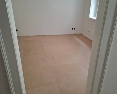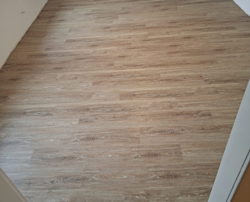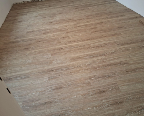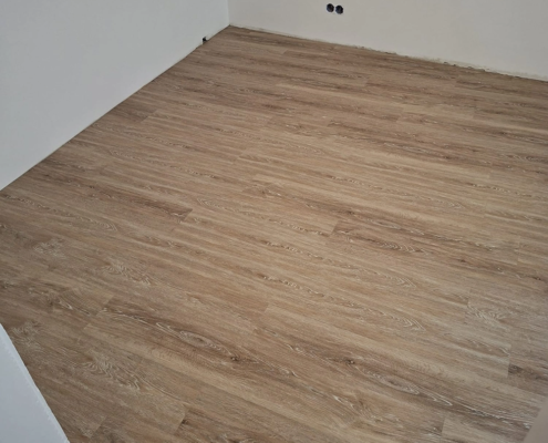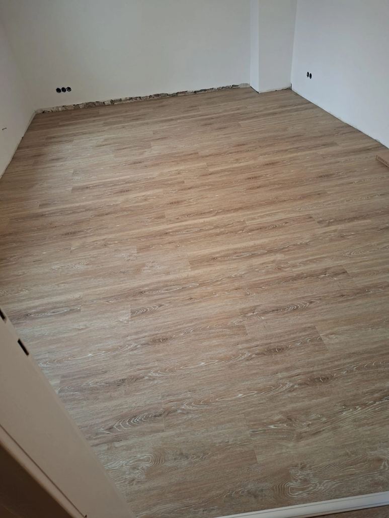 Nach der Vorbereitung wurde ein Vinylboden in heller Holzoptik verlegt. Er verleiht dem Raum eine moderne, freundliche Atmosphäre und überzeugt durch Strapazierfähigkeit und Pflegeleichtigkeit.