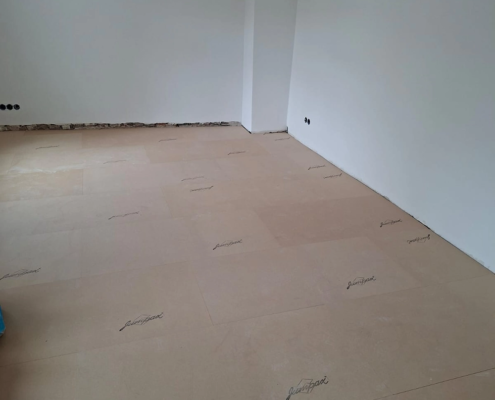 Der Untergrund wurde ausgeglichen und mit Dämm- und Ausgleichsplatten vorbereitet. Diese sorgen für eine plane Fläche, verbesserten Gehkomfort und eine spürbare Reduzierung von Geräuschen.
